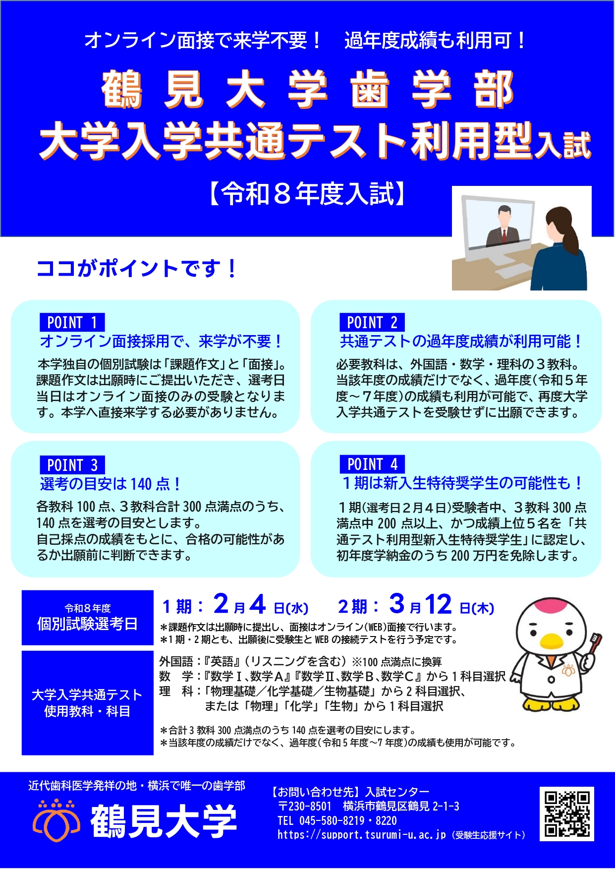 大学入学共通テストの成績を利用して大学受験予定の方は、ぜひこの機会に鶴見大学歯学部への出願をご検討ください。